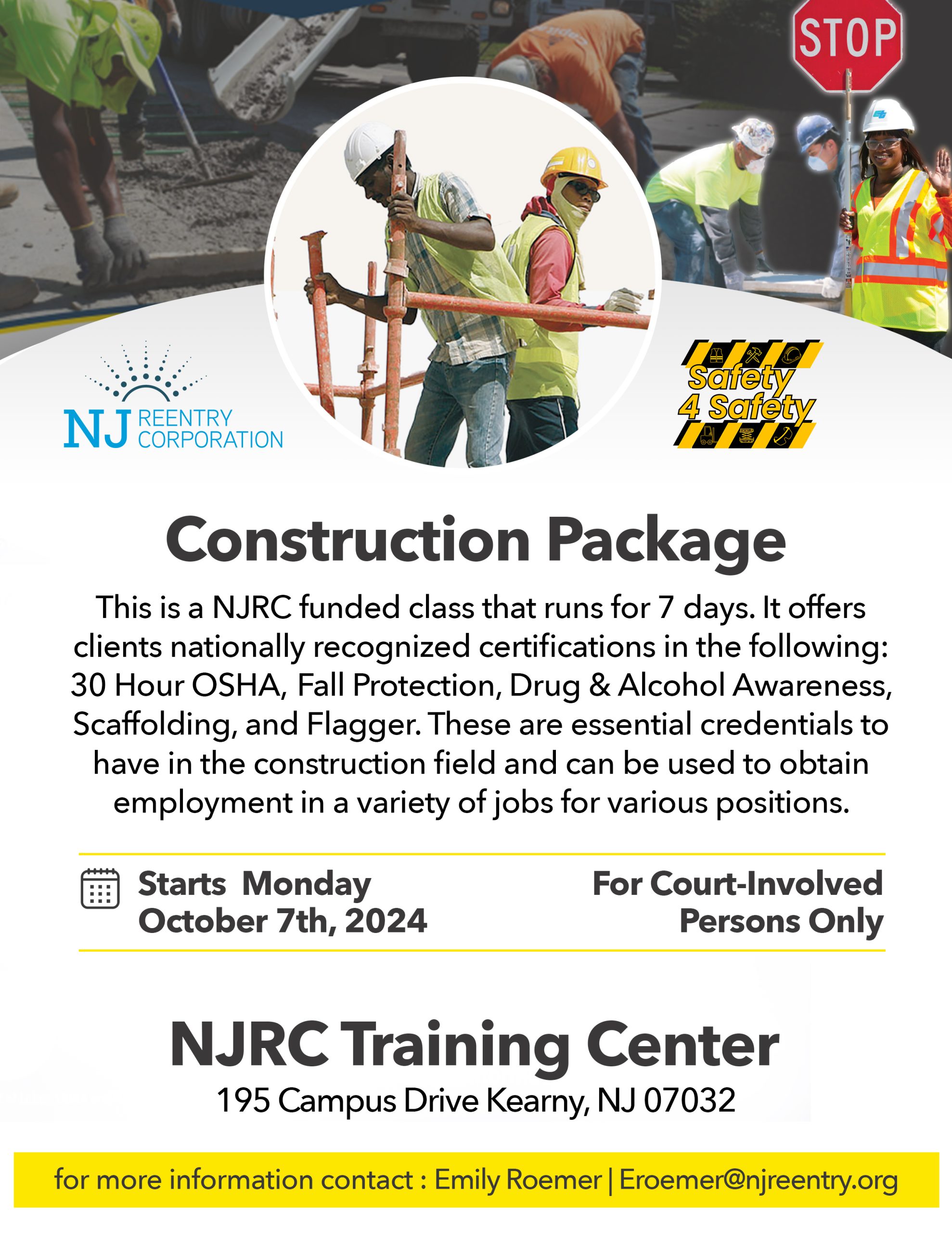 The Governor's Reentry Training & Employment Center 195 Campus Drive, Kearny, NJ, United StatesNJRC Construction Package Class This is a NJRC-funded class that runs for 7 days. It offers clients nationally recognized certifications in the following areas: 30-Hour OSHA, Fall Protection, Drug & Alcohol Awareness, Scaffolding, and Flagger. These essential credentials are valuable in the construction field and can help participants secure employment in various roles. Training Dates:…