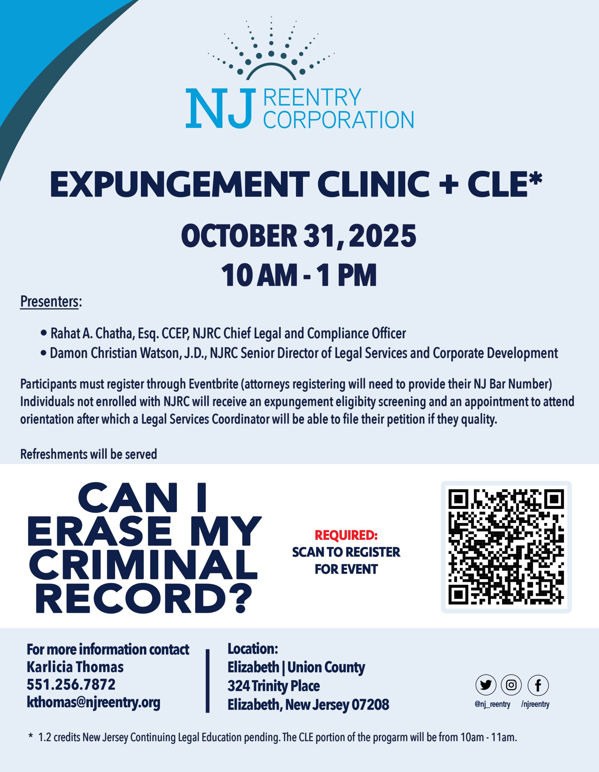 NJRC Elizabeth 324 Trinity Place, Elizabeth, NJ, United StatesThe New Jersey Reentry Corporation Presents: EXPUNGEMENT CLINIC + CLE* Date: October 31, 2025Time: 10:00 AM – 1:00 PMLocation: Union County – 324 Trinity Place, Elizabeth, NJ 07208 Can I Erase My Criminal Record? Join us for a free Expungement Clinic to learn about your rights and options for clearing your criminal record. Presenters: Rahat A.…