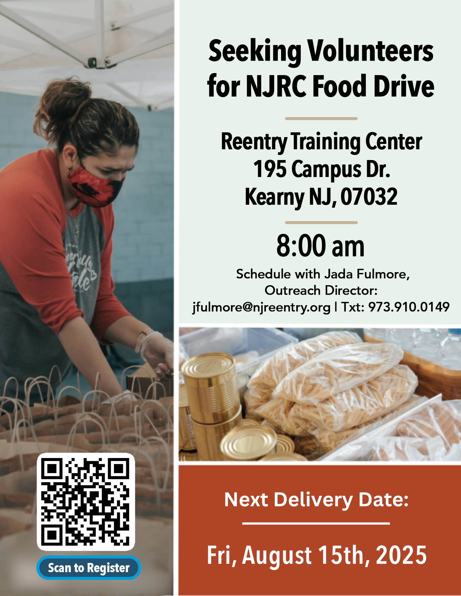 The Governor's Reentry Training & Employment Center 195 Campus Drive, Kearny, NJ, United StatesJoin us in making a difference by helping us support our community! Location: Reentry Training Center, 195 Campus Dr., Kearny, NJ 07032 Time: 8:00 AM Next Delivery Date: Thursday, August 15, 2025 We are looking for volunteers to assist with the NJRC Food Drive. If you're interested in lending a hand, please reach out to…