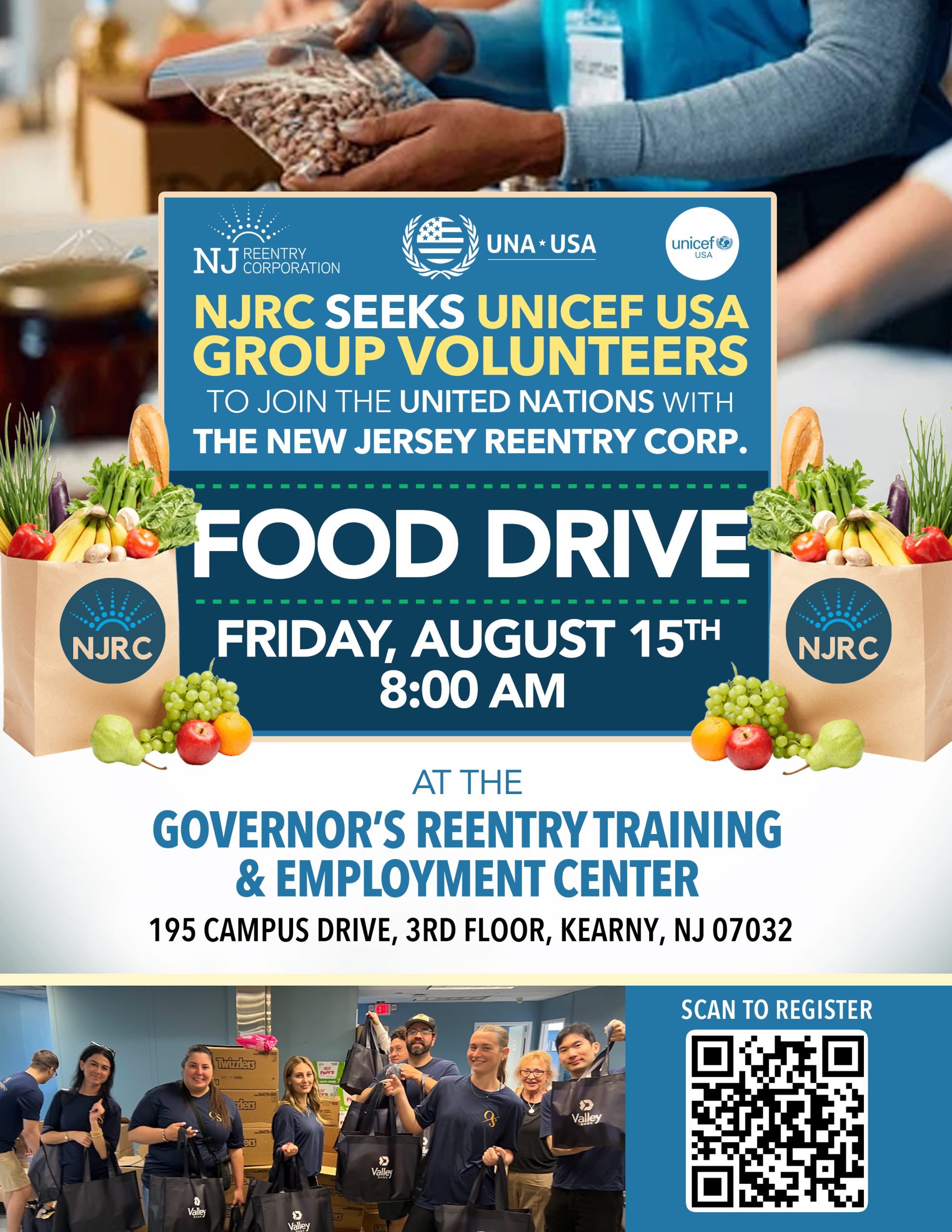 The Governor's Reentry Training & Employment Center 195 Campus Drive, Kearny, NJ, United StatesNJ Reentry CorporationIn Partnership with UNA-USA & UNICEF USA NJRC Seeks UNICEF USA Group Volunteers Join the New Jersey Reentry Corporation in partnership with the United Nations Association (UNA-USA) and UNICEF USA for a community Food Drive. Date: Friday, August 15, 2025Time: 8:00 AMLocation:The Governor’s Reentry Training & Employment Center195 Campus Drive, 3rd Floor, Kearny,…
