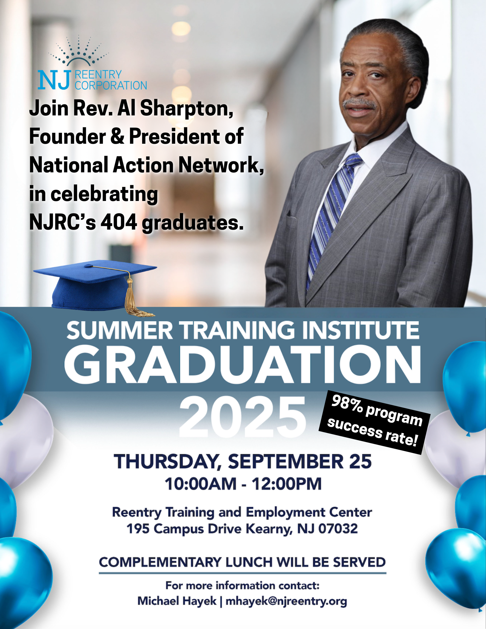 The Governor's Reentry Training & Employment Center 195 Campus Drive, Kearny, NJ, United StatesSummer Training Institute Graduation 2025 Date: Thursday, September 25, 2025Time: 10:00 AM – 12:00 PMLocation:Reentry Training and Employment Center195 Campus DriveKearny, NJ 07032 Join us as we celebrate the accomplishments of the 2025 Summer Training Institute graduates. This event honors the hard work, dedication, and achievements of participants preparing to reenter the workforce and build…