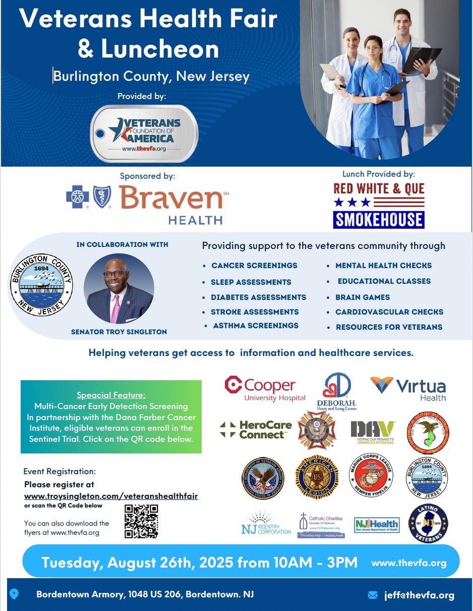 Bordentown Armory 1048 US-206, Bordentown, NJ, United StatesBurlington County, New Jersey Tuesday, August 26, 202510:00 AM – 3:00 PMBordentown Armory, 1048 US-206, Bordentown, NJ Presented by: Veterans Foundation of Burlington Countywww.thevfa.org Sponsored by: Braven™In collaboration with Senator Troy Singleton Lunch Provided By: Red White & Que Smokehouse Supporting Our Veterans with: Cancer Screenings Sleep Assessments Diabetes Assessments Stroke Risk Assessments Asthma Screenings…