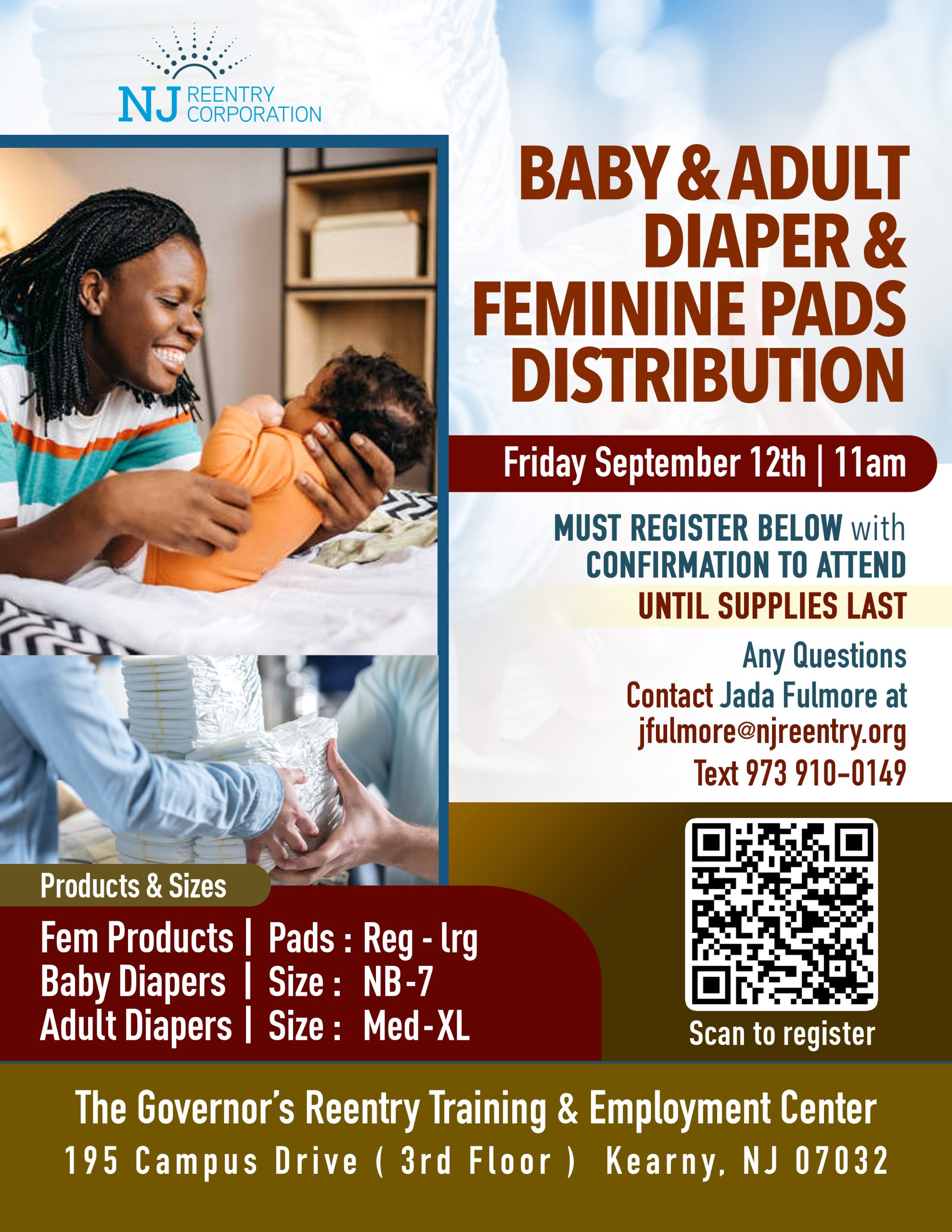 The Governor's Reentry Training & Employment Center 195 Campus Drive, Kearny, NJ, United StatesNJRC BABY & ADULT DIAPER & FEMININE PADS DISTRIBUTION Friday, September 12, 2025 | 11:00 am - 3:00 pm Make sure to register below and get a confirmation to attend, as supplies last! Products & Sizes: Fem Products: Pads (Reg - Lrg) Baby Diapers: Size NB-7 Adult Diapers: Size Med-XL Location: The Governor's Reentry Training & Employment Center 195 Campus Drive (3rd Floor), Kearny, NJ 07032 For any questions, please contact: Jada Fulmore at jfulmore@njreentry.org or text 973.910.0149. Don't miss out, join us and help make a difference!