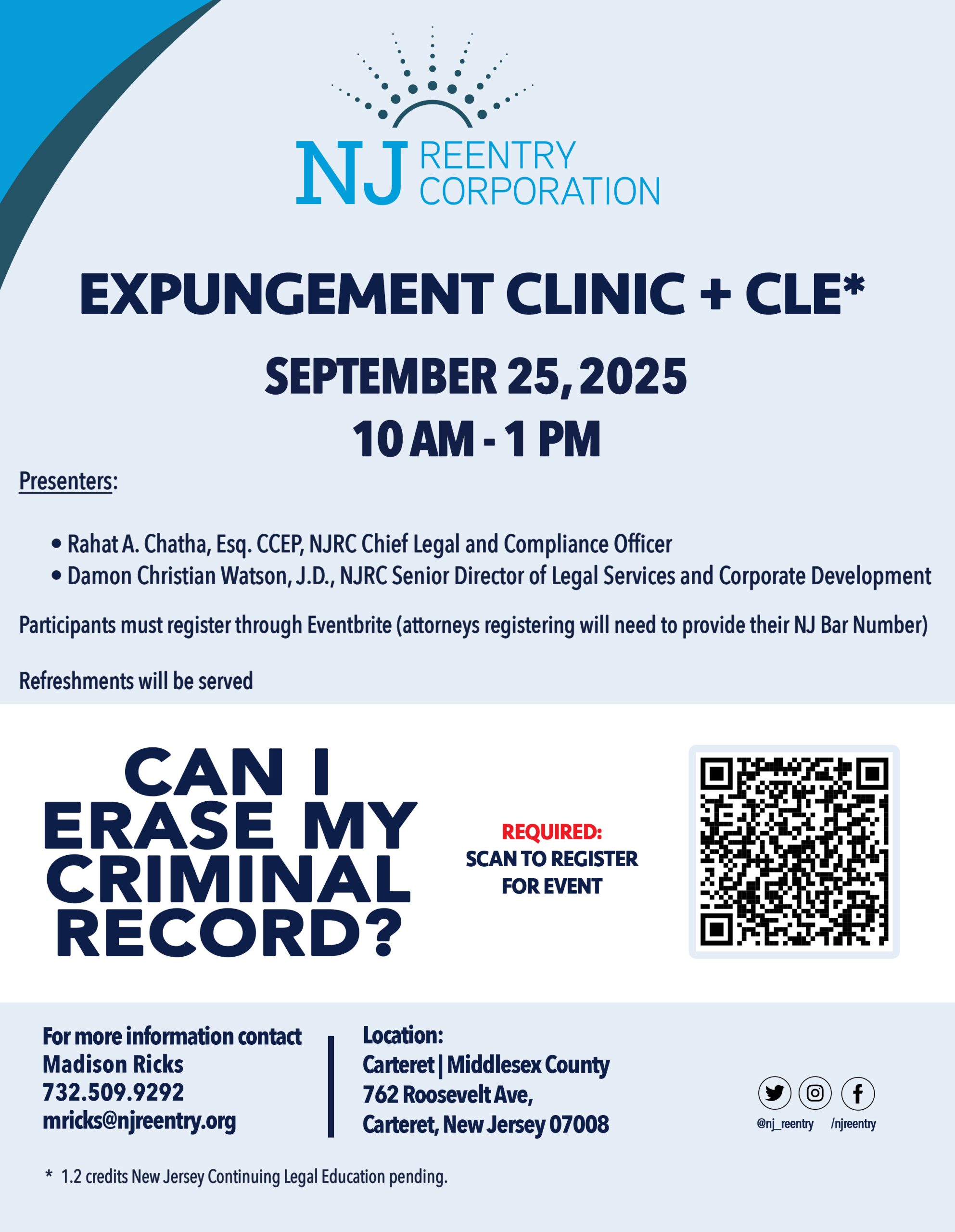 NJRC Carteret 762 Roosevelt Ave., Carteret, NJ, United StatesThe New Jersey Reentry Corporation Presents: EXPUNGEMENT CLINIC + CLE* Date: September 25, 2025Time: 10:00 AM – 1:00 PMLocation: Middlesex County – 762B Roosevelt Avenue, Carteret, New Jersey 07008 Can I Erase My Criminal Record? Join us for a free Expungement Clinic to learn about your rights and options for clearing your criminal record. Presenters: Rahat…