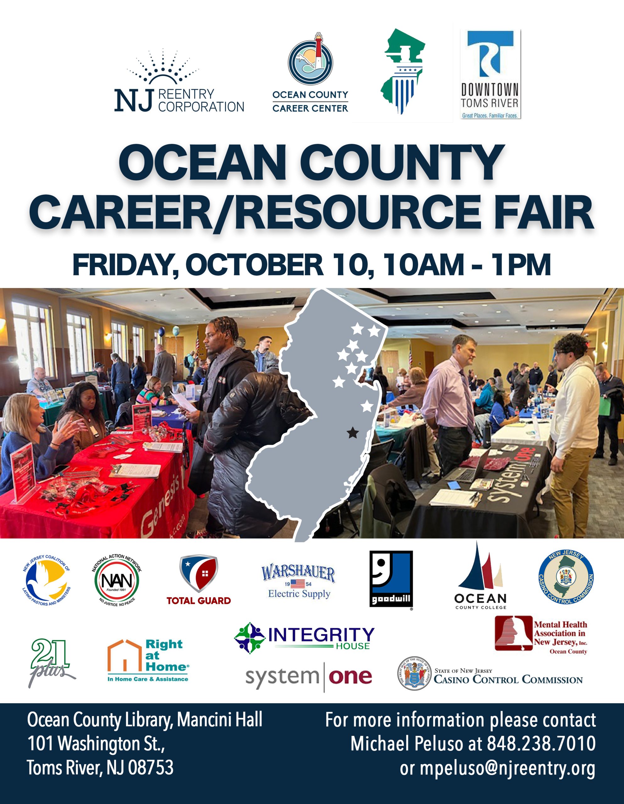 Ocean County Library Mancini Hall 101 Washington St., Toms River, NJ, United StatesNJRC Ocean County Career Center, in partnership with Downtown Toms River, proudly presents: Ocean County Career & Resource Fair Date: Friday, October 10Time: 10:00 AM – 1:00 PMLocation: Ocean County Library, Mancini Hall101 Washington Street, Toms River, NJ 08753 Participating Organizations Include: Ocean County College Ocean County Career Center Genesis Network Right at Home – In…