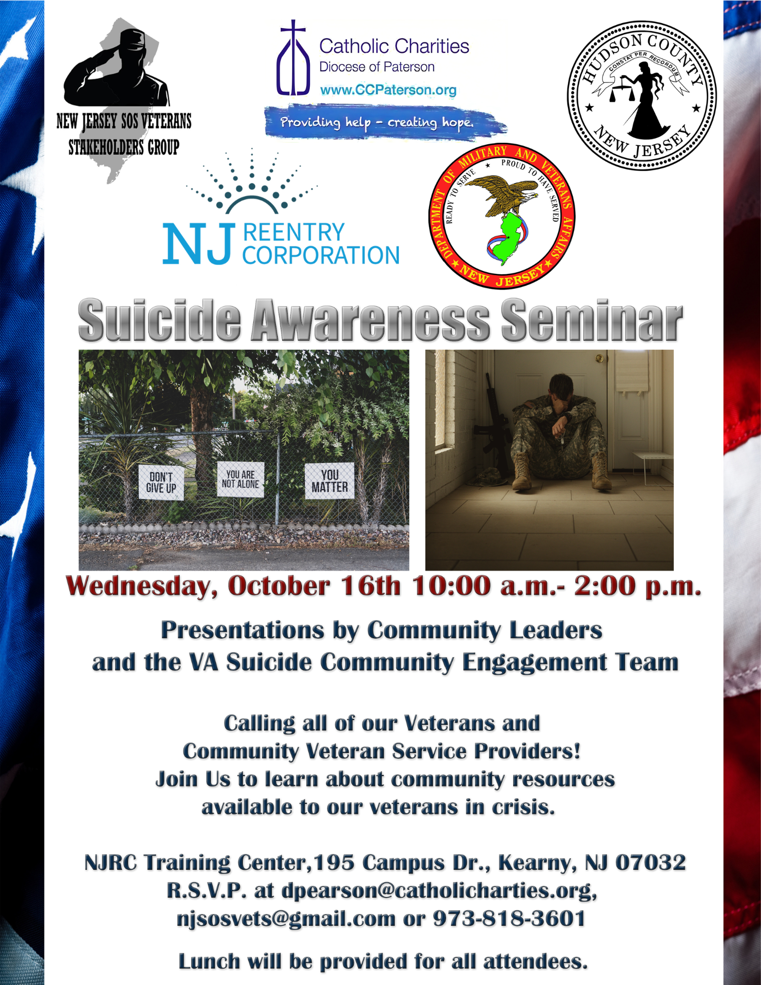The Governor's Reentry Training & Employment Center 195 Campus Drive, Kearny, NJ, United StatesSuicide Awareness Seminar Wednesday, October 16th, 10:00 a.m.- 2:00 p.m. Presentations by Community Leaders and the VA Suicide Community Engagement Team Calling all of our Veterans and Community Veteran Service Providers! Join Us to learn about community resources available to our veterans in crisis. NJRC Training Center, 195 Campus Dr., Kearny, NJ 07032 R.S.V.P. at…
