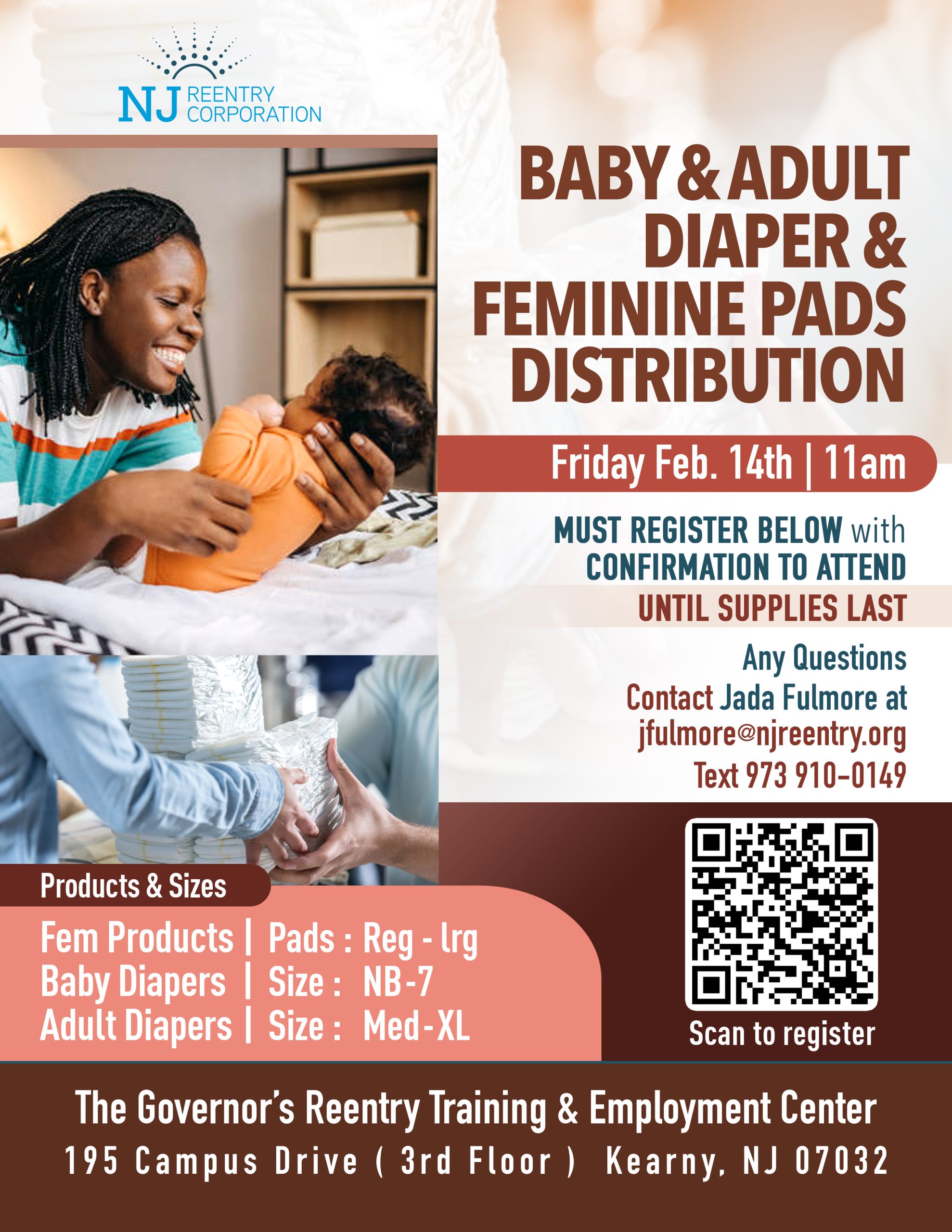 The Governor's Reentry Training & Employment Center 195 Campus Drive, Kearny, NJ, United StatesNJRC BABY & ADULT DIAPER & FEMININE PADS DISTRIBUTION Friday, February 14th, 2025 | 11:00 am - 3:00 pm Make sure to register below and get a confirmation to attend, as supplies last! Products & Sizes: Fem Products: Pads (Reg - Lrg) Baby Diapers: Size NB-7 Adult Diapers: Size Med-XL Location: The Governor's Reentry Training & Employment Center 195 Campus Drive (3rd Floor), Kearny, NJ 07032 For any questions, please contact: Jada Fulmore at jfulmore@njreentry.org or text 973.910.0149. Don't miss out, join us and help make a difference!