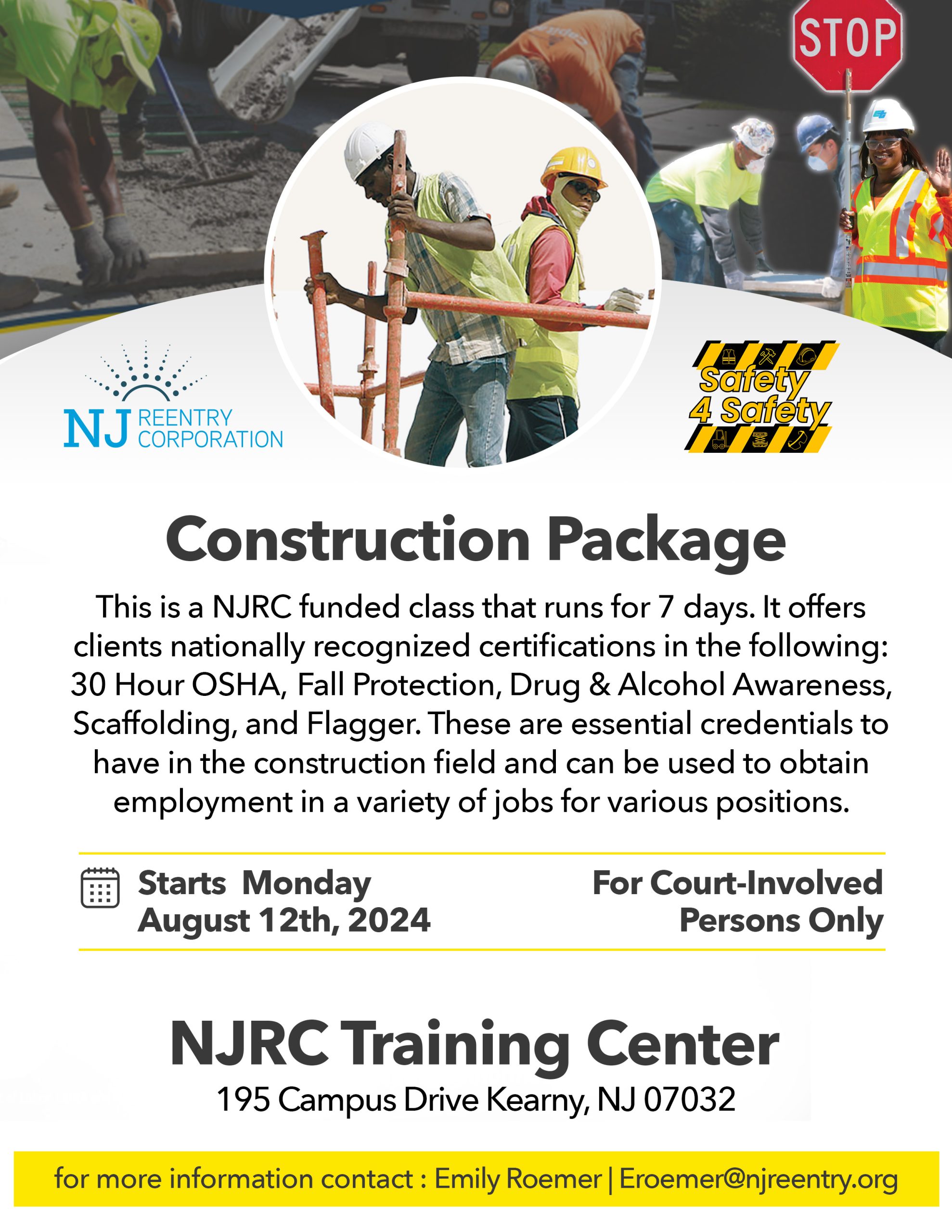 Starts Monday, August 12th, 2024 at The Governor’s Reentry Training and Employment Center 195 Campus Drive Kearny, NJ 07032