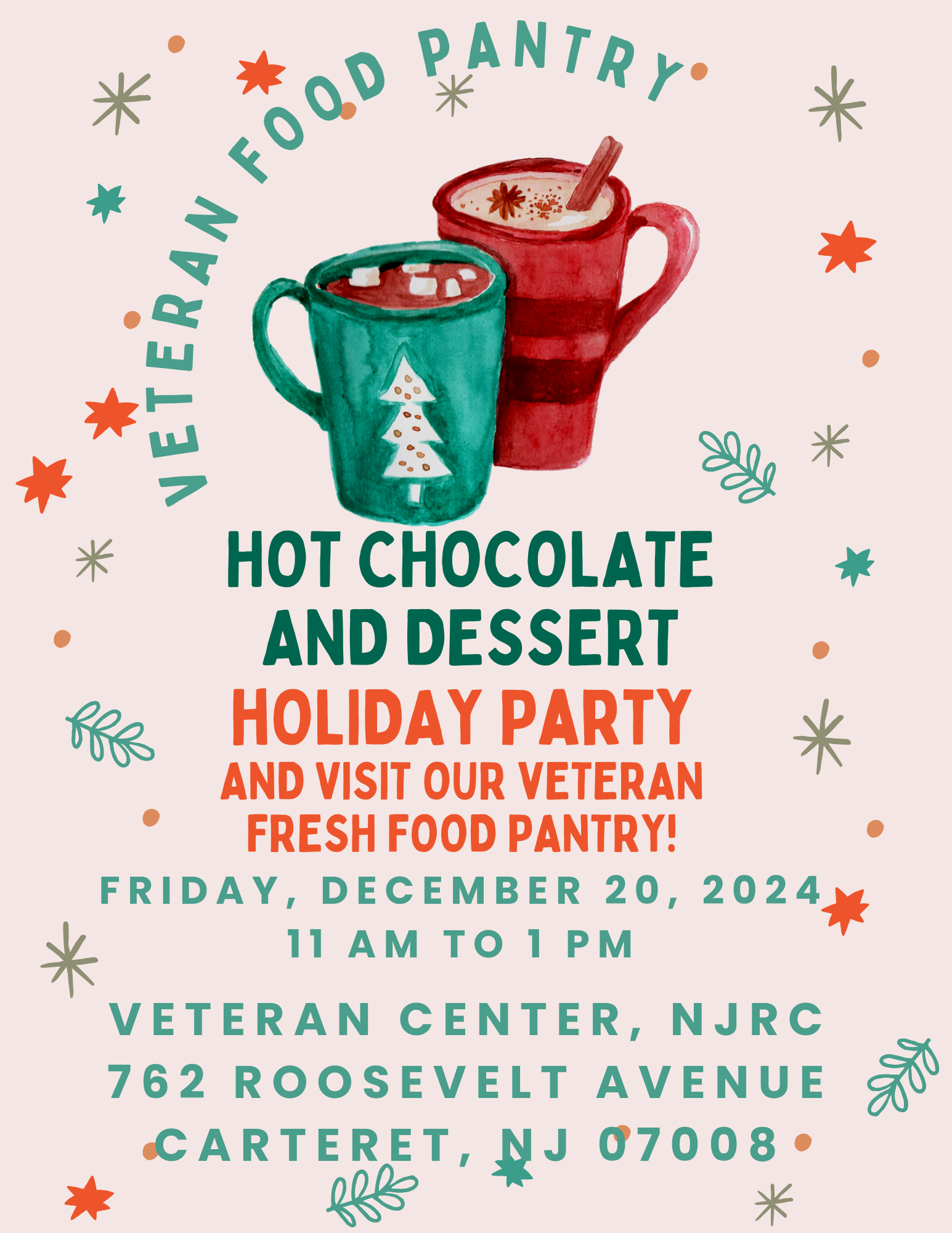 NJRC Carteret 762 Roosevelt Ave., Carteret, NJ, United StatesJoin Us for a Holiday Celebration at the Veteran Food Pantry! Hot Chocolate and Dessert Holiday Party Come celebrate the season and support our veterans! Date: Friday, December 20, 2024 Time: 11:00 AM - 1:00 PM Location: Veteran Center, NJRC 762 Roosevelt Avenue Carteret, NJ 07008 Enjoy hot chocolate, delicious desserts, and visit our Veteran…