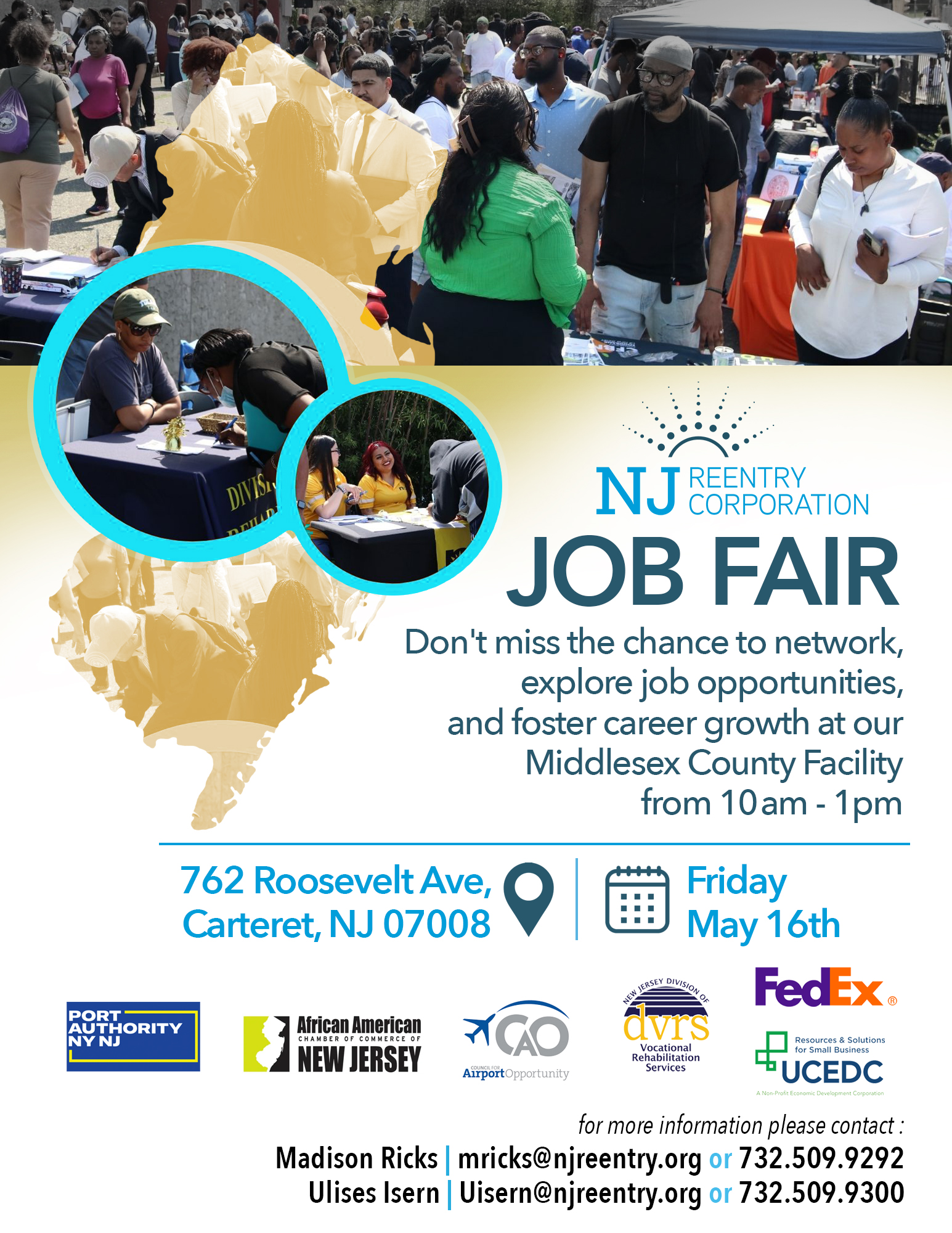 NJRC Carteret 762 Roosevelt Ave., Carteret, NJ, United StatesNew Jersey Reentry Corporation cordially invites you to participate in our Middlesex County Job Fair, Connecting Communities with Career Opportunities. Save the Date:Friday, May 16th | 10:00 AM – 1:00 PM Carteret Reentry Site: 762 Roosevelt Avenue, Carteret, NJ 07008 Don’t miss this incredible opportunity to network with employers, explore job openings, and take the…