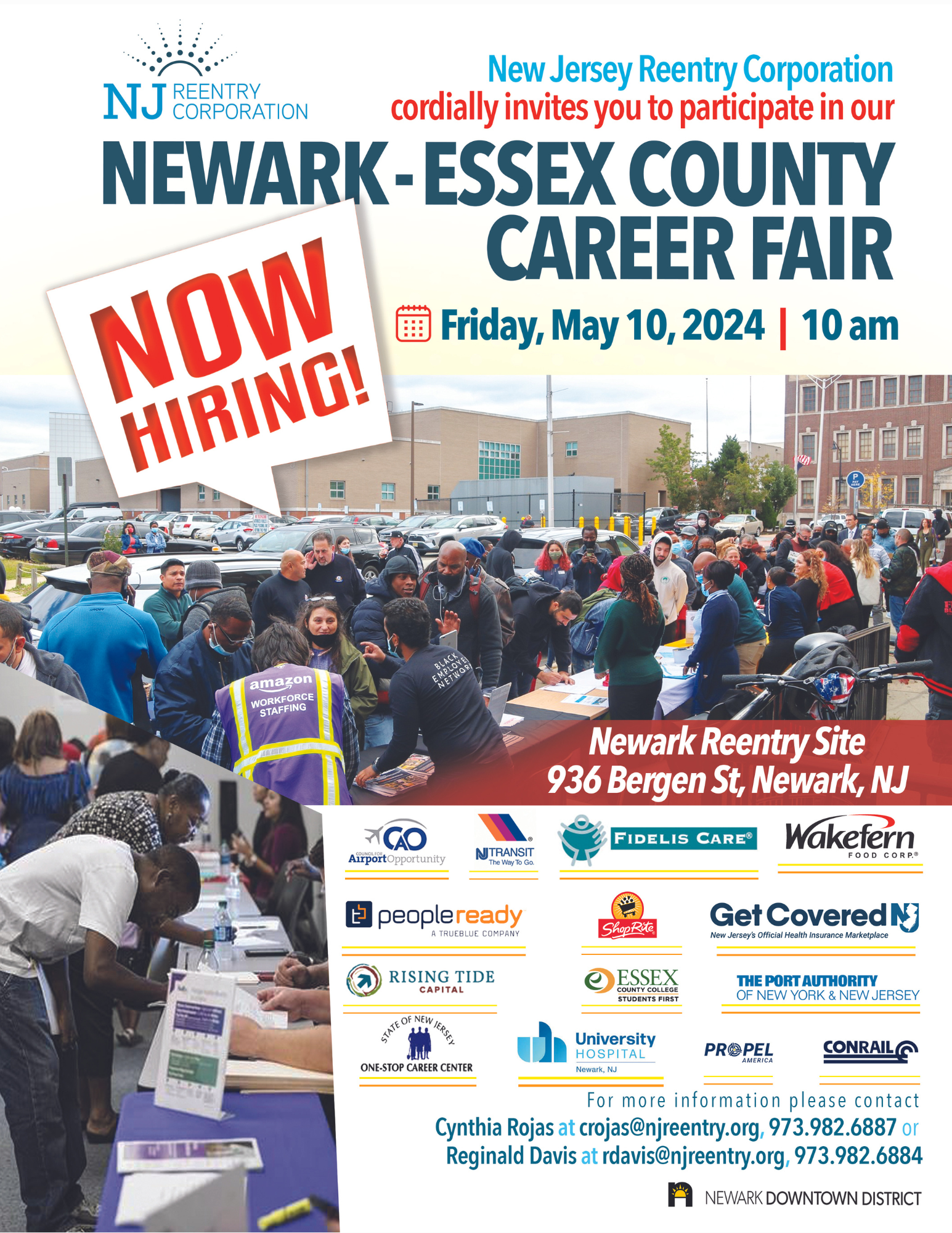 NJRC Newark 936 Bergen Street, Newark, United StatesNJRC Newark Job Fair Newark Reentry Site cordially invites you to participate in our Newark-Essex County Career Fair. This Friday, May 10th, from 10:00 am to 1:00 pm. Hosted at 936 Bergen Street, Newark, NJ 07112 For more information please contact: Cynthia Rojas at crojas@njreentry.org, 973.982.6887 Reginald Davis at rdavis@njreentry.org, 973.982.6884