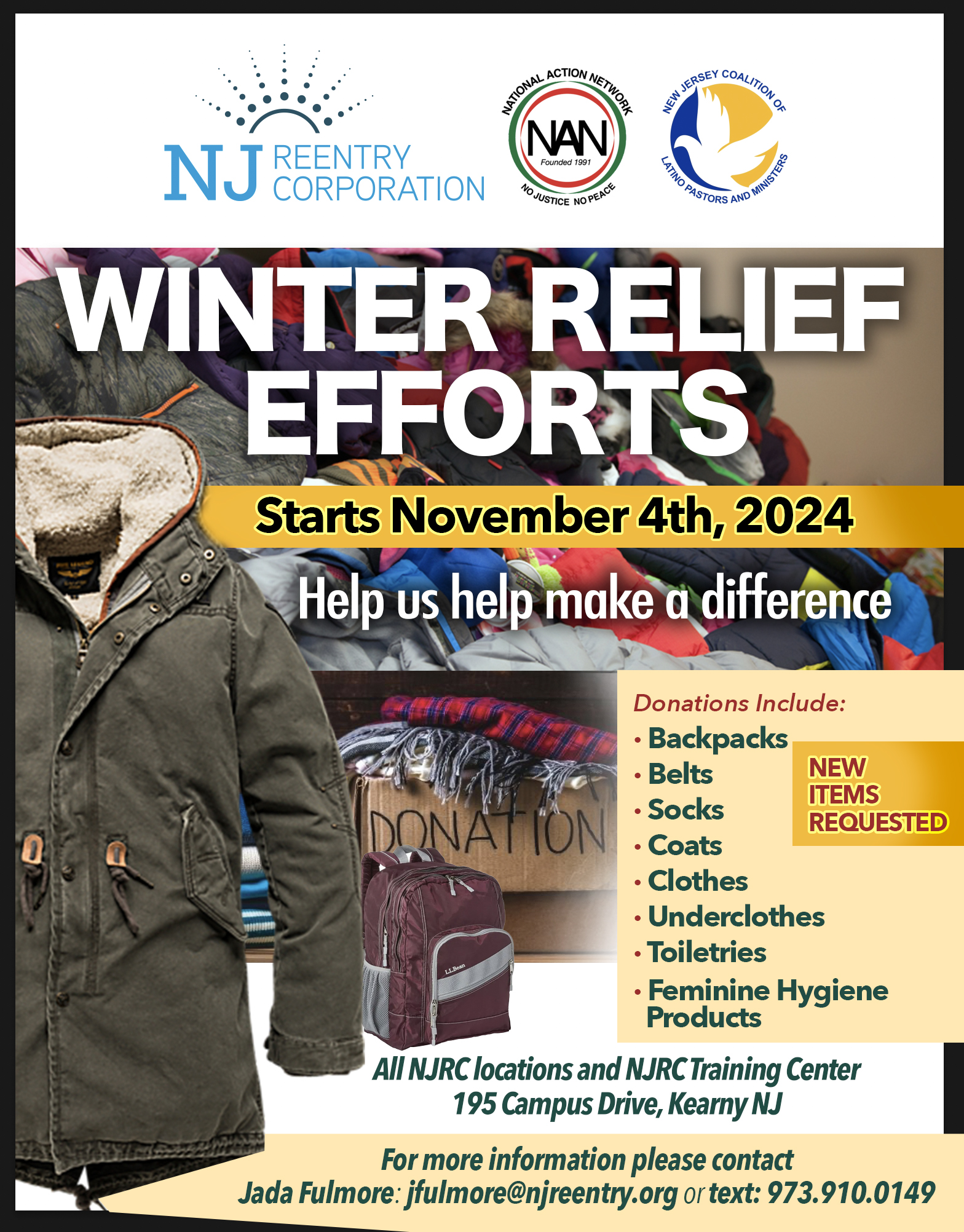 The Governor's Reentry Training & Employment Center 195 Campus Drive, Kearny, NJ, United States +8 moreNJ REENTRY CORPORATION WINTER RELIEF EFFORTS Starting November 4th, 2024, help us make a real difference this winter! We are accepting donations of: Backpacks Belts Socks Coats Clothes Underclothes Toiletries Feminine Hygiene Products NEW ITEMS REQUESTED Please drop off all items at any NJRC location or our Training Center: 195 Campus Drive, Kearny, NJ For more information or to coordinate a donation, please contact: Jada Fulmore at jfulmore@njreentry.org or text: 973.910.0149. Your generosity will provide much-needed warmth and essentials to those in need this winter. Every donation counts. Let’s come together to support our community and ensure no one goes without essential items this season!