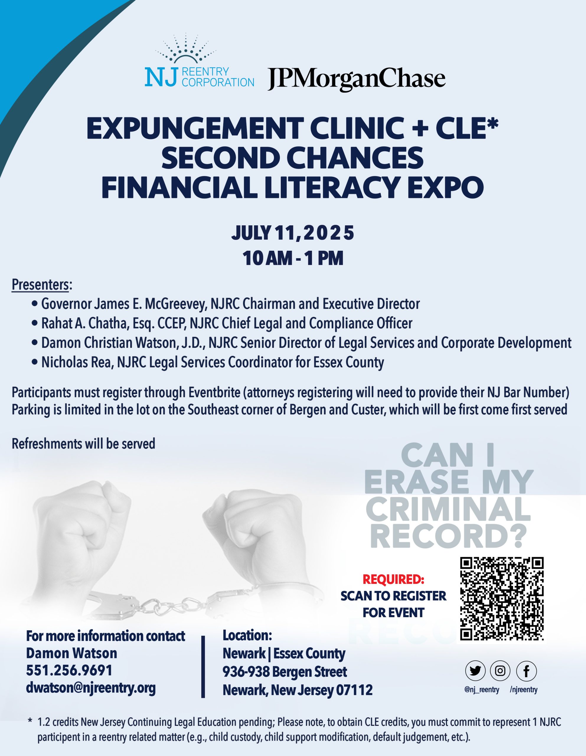 NJRC Newark 936 Bergen Street, Newark, United StatesThe New Jersey Reentry Corporation in partnership with JPMorganChase Presents: EXPUNGEMENT CLINIC + CLE* SECOND CHANCES FINANCIAL LITERACY EXPO Date: Friday, July 11, 2025Time: 10:00 AM – 1:00 PMLocation: 936-938 Bergen Street, Newark, NJ 07112 (Essex County) Featured Presenters: Governor James E. McGreevey – NJRC Chairman and Executive Director Rahat A. Chatha, Esq., CCEP –…